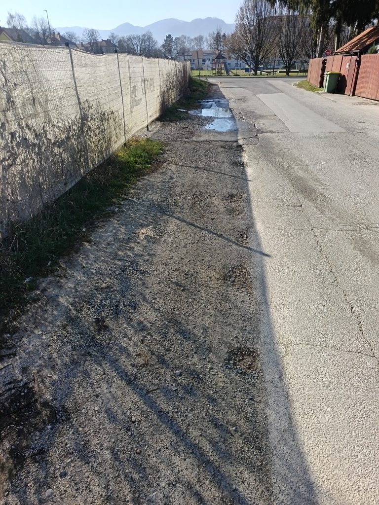 Na sliki lahko vidimo neurejene bankine in razpadajoč asfalt na Cesti v Lokrovec. To ni tisti del ceste, ki je trenutno v izgradnji – 270 metrov – II. faza, ampak del, ki letos ne bo prišel na vrsto. Ta cesta je povezava tako do osnovne šole in vrtca, kot tudi do dvesto, pred leti zgrajenih stanovanj.